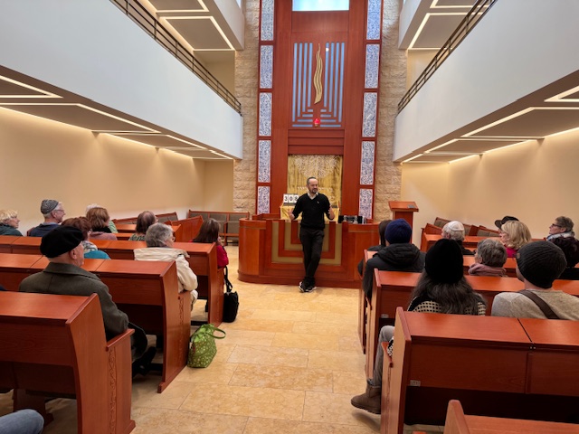Foto: Rabbiner Avraham Radbil vor einem stilisierten Chanukka-Leuchter in der Synagoge Konstanz. Die Aufnahme ist entstanden bei seiner Führung durch die Synagoge Konstanz am 16.12.24. Copyright: privat