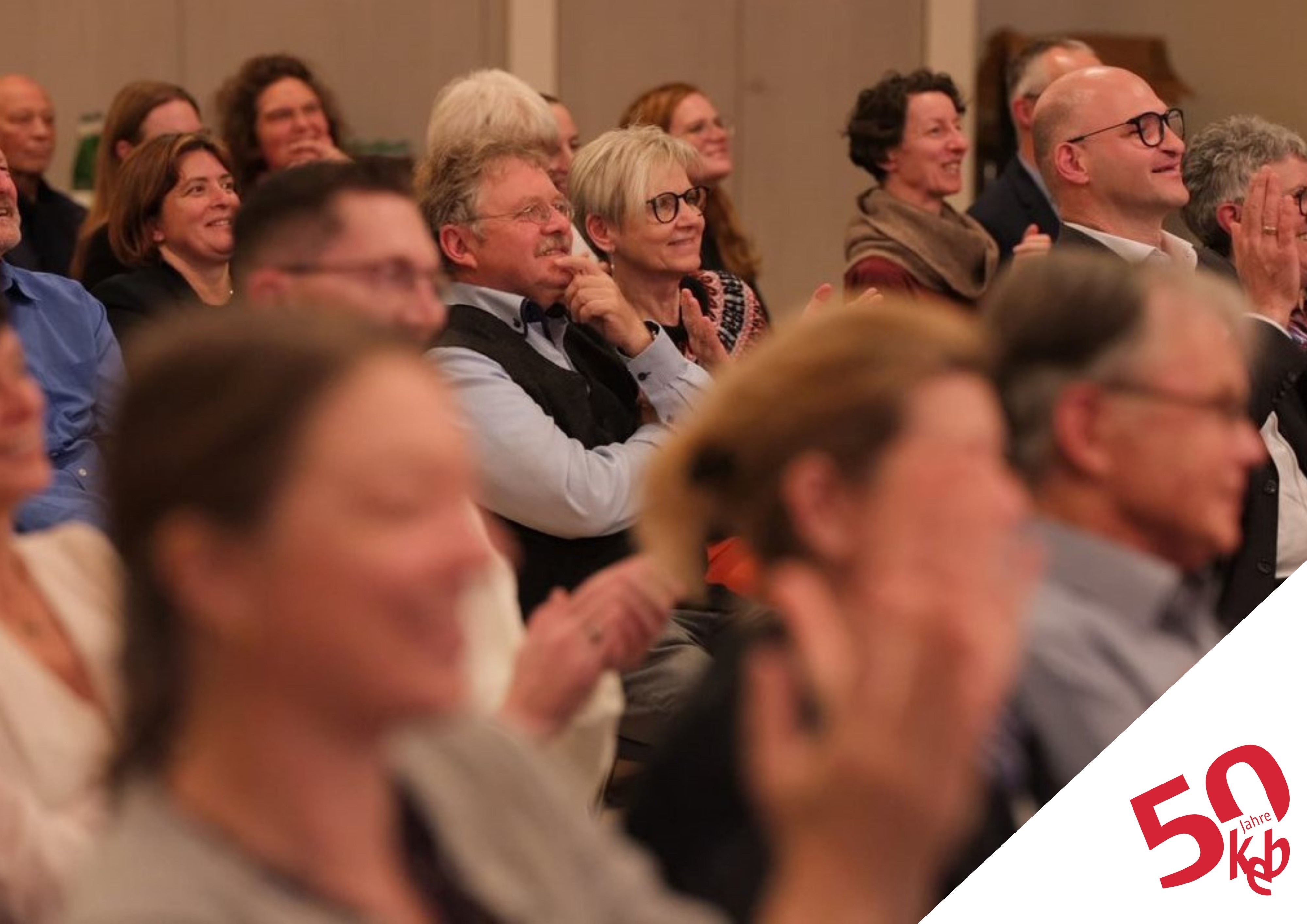 Dr. Johanna Gebrande, Geschäftsführerin der keb Diözese Rottenburg-Stuttgart, gratulierte zum 50. Jubiläum und sprach ihre guten Gelingenswünsche aus. Anschließend griff die Kabarettistin Marlies Blume das Motto „50 Jahre Bildung mit Kopf, Herz und Hand“ geistreich, humorvoll und mit vollem Körpereinsatz auf – als „Hebamme für den göttlichen Funken“ in jedem Menschen.